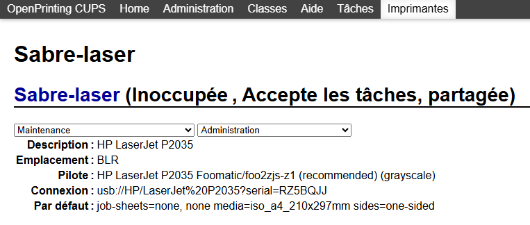 L’imprimante est détectée toute seule par CUPS, un outil open-source bien connu pour gérer ses imprimantes sous Unix, Linux et dérivés. Pas besoin d’installer de driver (j’ai choisi celui recommandé pré-installé par CUPS) et c’est tant mieux, car les drivers officiels sont obsolètes, je n’ai même pas réussi à les installer (notamment en raison d’une dépendance qui a changé de nom entre temps). Il suffit de se rendre sur l’inteface de CUPS pour retrouver l’imprimante et imprimer une page de test : https://localhost:631. J’en ai profité pour la renommer et activer le partage.