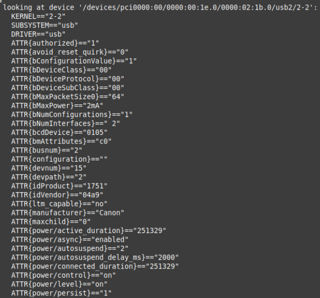 On peut récupérer les infos utiles avec cette commande, juste après le démarrage de l’imprimante : udevadm monitor --environment --udev. On obtient :